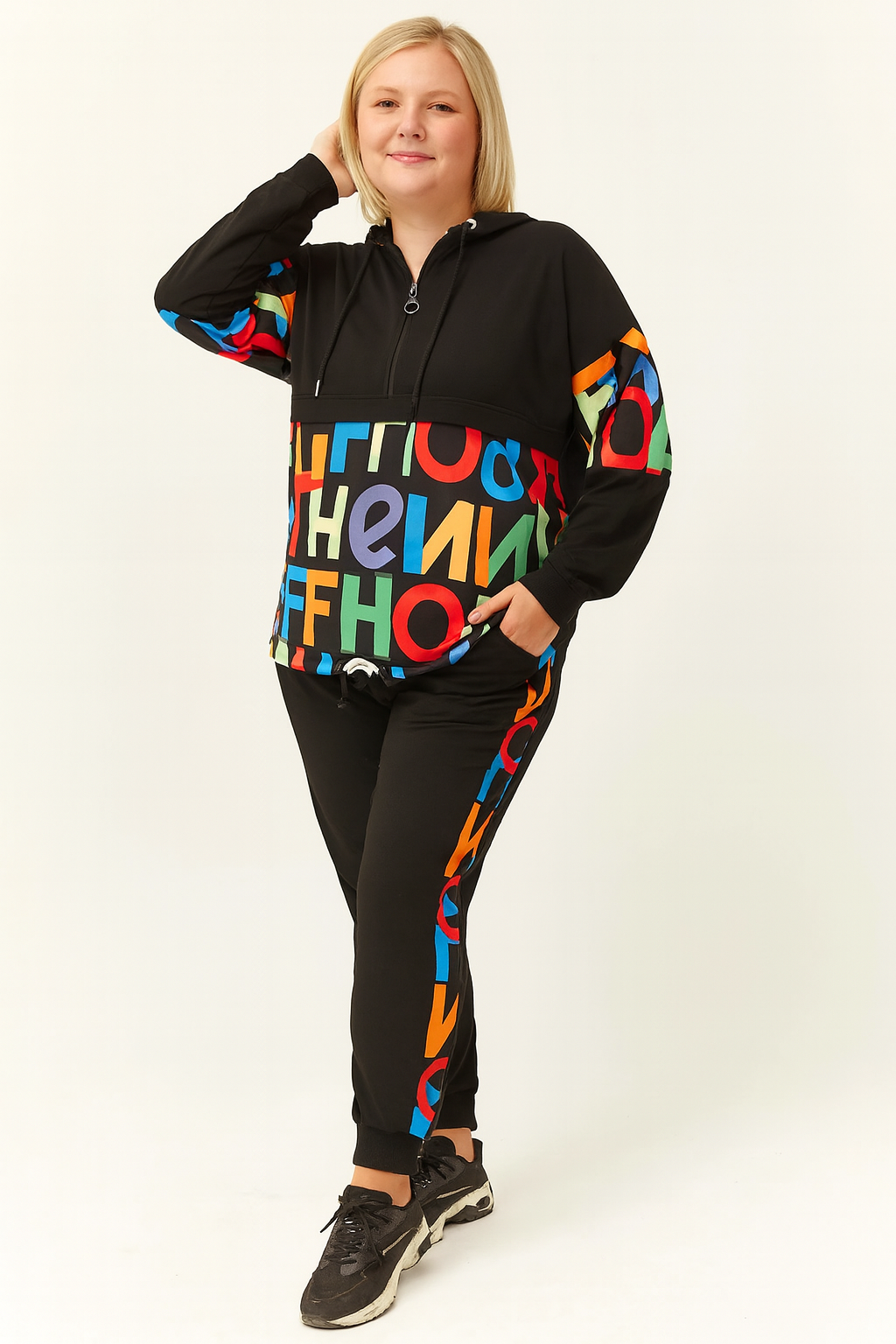 Het ontwerp met gekleurde letterprint geeft het pak een moderne en energieke uitstraling, perfect voor een casual, trendy look.